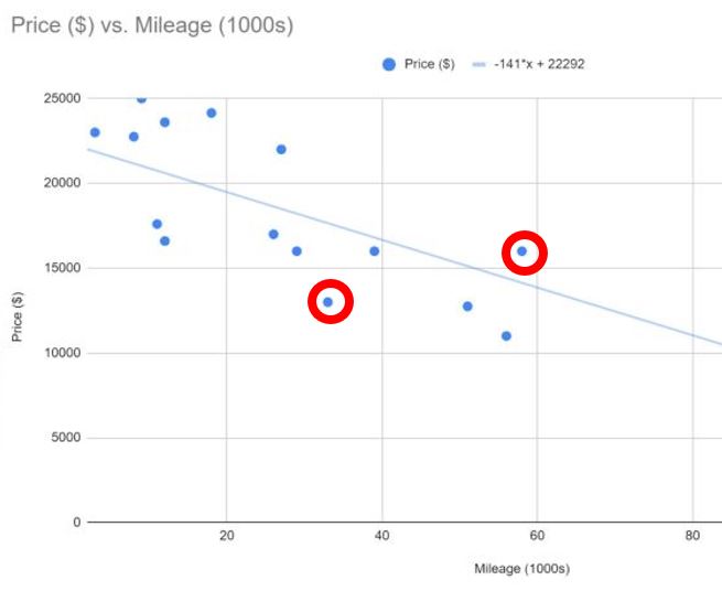 Finally, we discuss that this is a general trend but that it is not always true for each car. I highlight a couple points where one of the cars has more miles and a higher price (below). This leads into a discussion about additional factors influencing price.