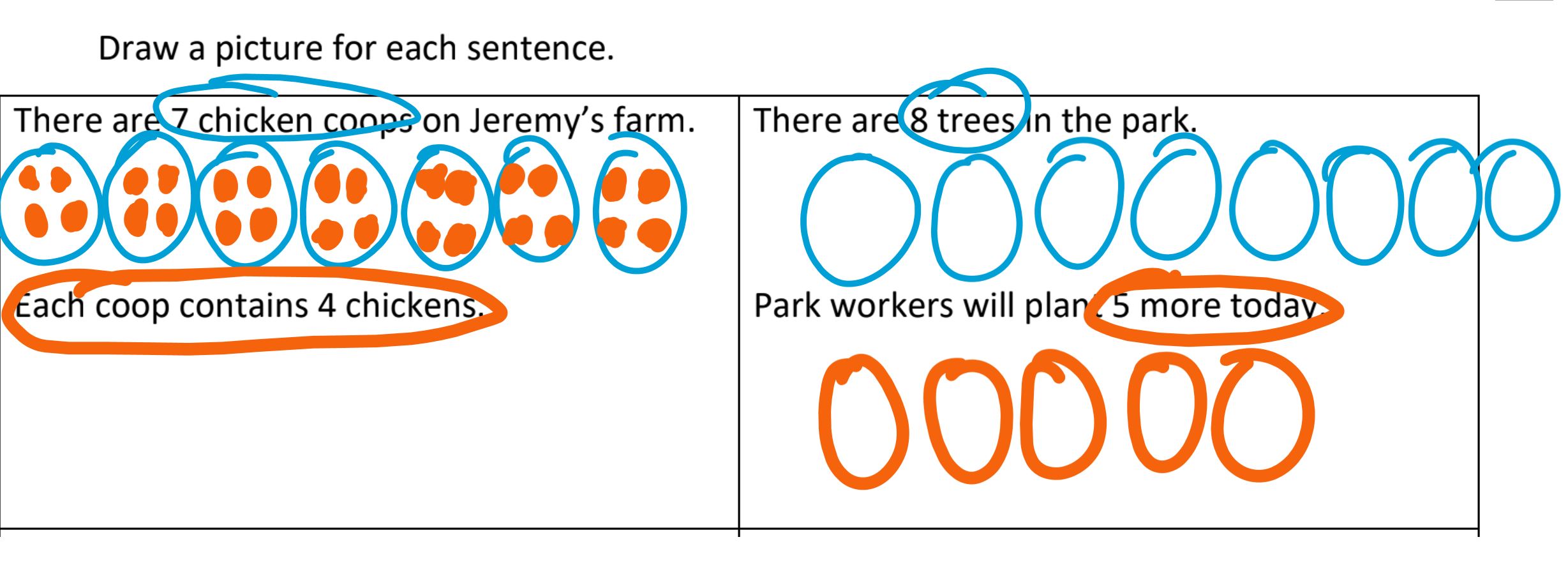 I posted previously about unpacking word problems involving multiplication or Slope. Here is an update. I have students draw a picture for the quantities identified. The multiplication situations become apparent when groups of objects are arise through the drawing, in contrast to an addition problem (right).
