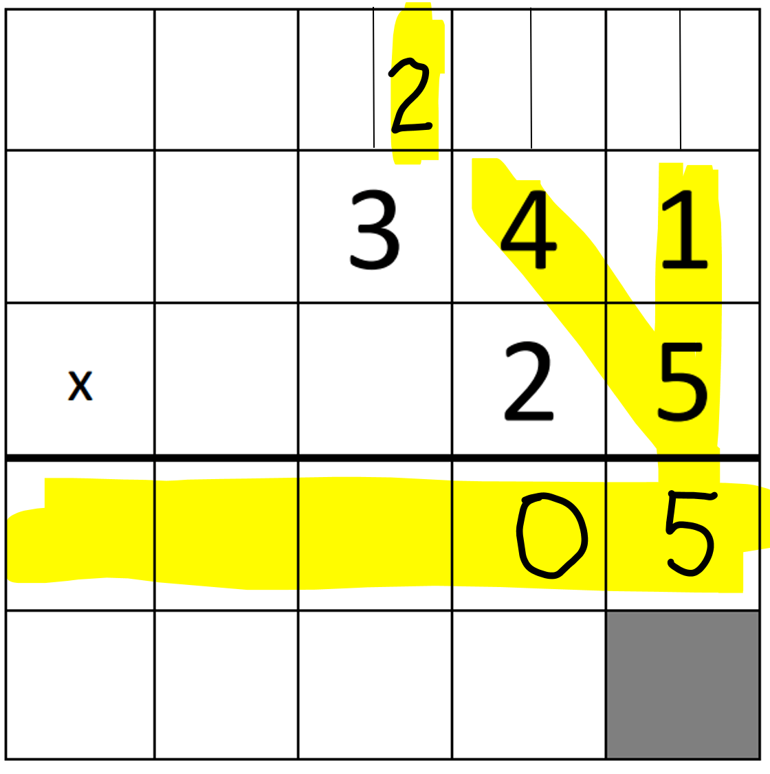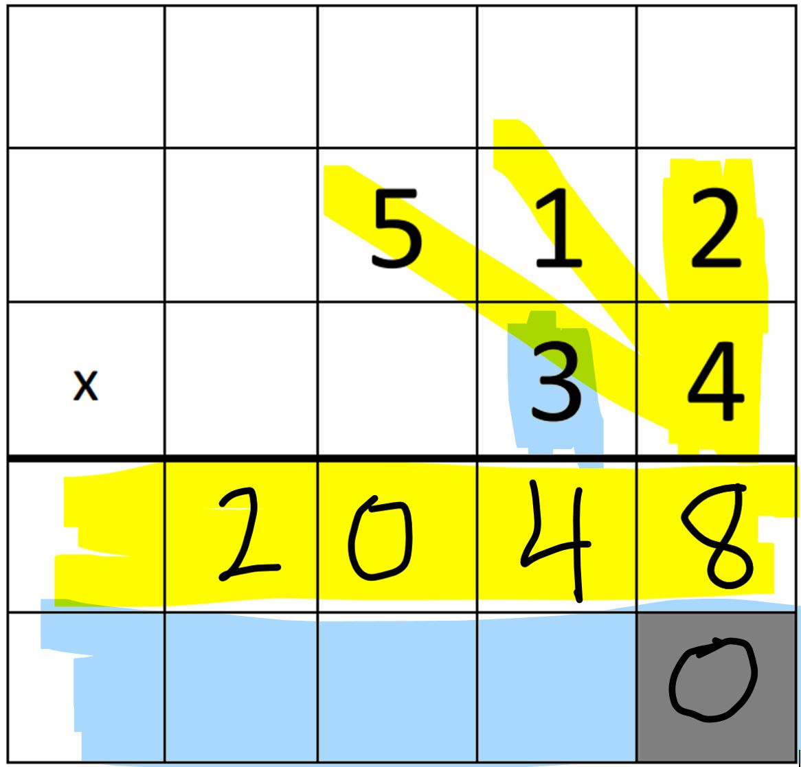 First highlight the ones-digit in and the row for the product that results from the ones-digit. This helps unpack the place value and why the algorithm works. Note: use a lighter color of highlighter (you will see why).